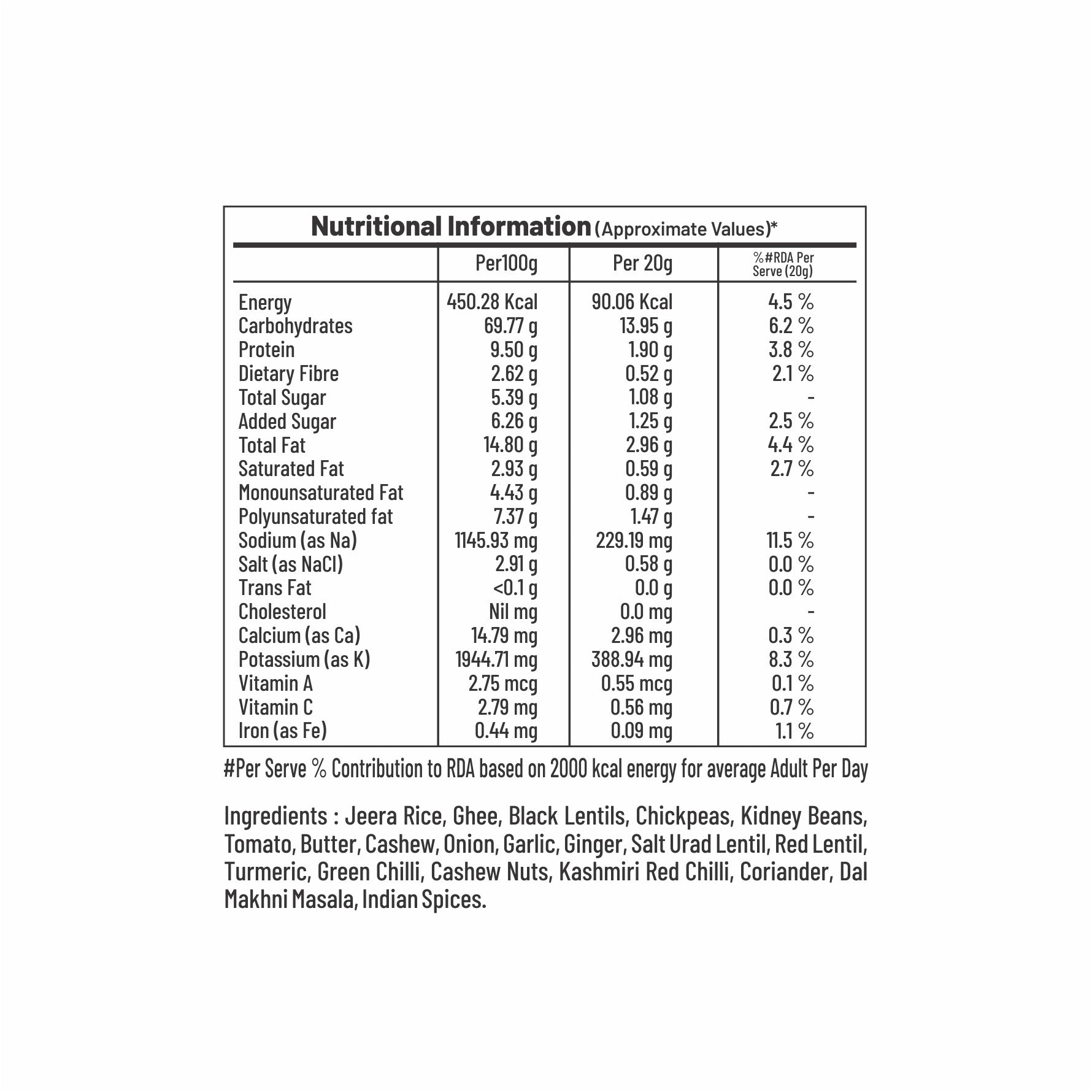Enjoy the rich and creamy Dal Makhani paired with aromatic Jeera Rice – a wholesome, satisfying meal that’s ready in minutes! Made with slow-cooked black lentils, butter, and a blend of authentic spices, this dish delivers the taste of home-cooked goodness with the convenience of an instant meal.
