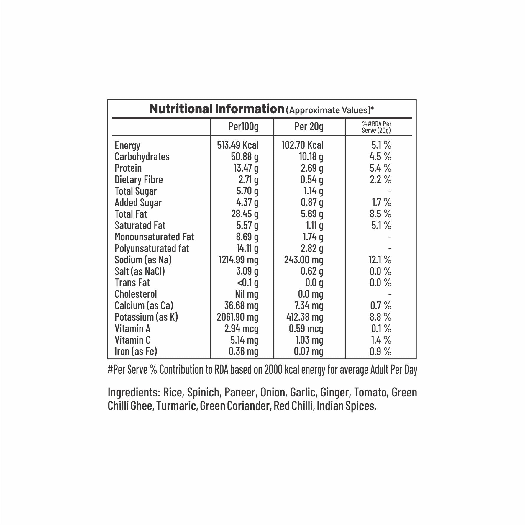 Enjoy the goodness of fresh spinach and soft paneer paired with aromatic jeera rice in this delicious and wholesome meal. Made with fresh spinach puree, paneer cubes, and authentic Indian spices, this dish is packed with nutrients and rich flavors. Served alongside perfectly seasoned cumin rice, it’s a complete meal that is ready in minutes!