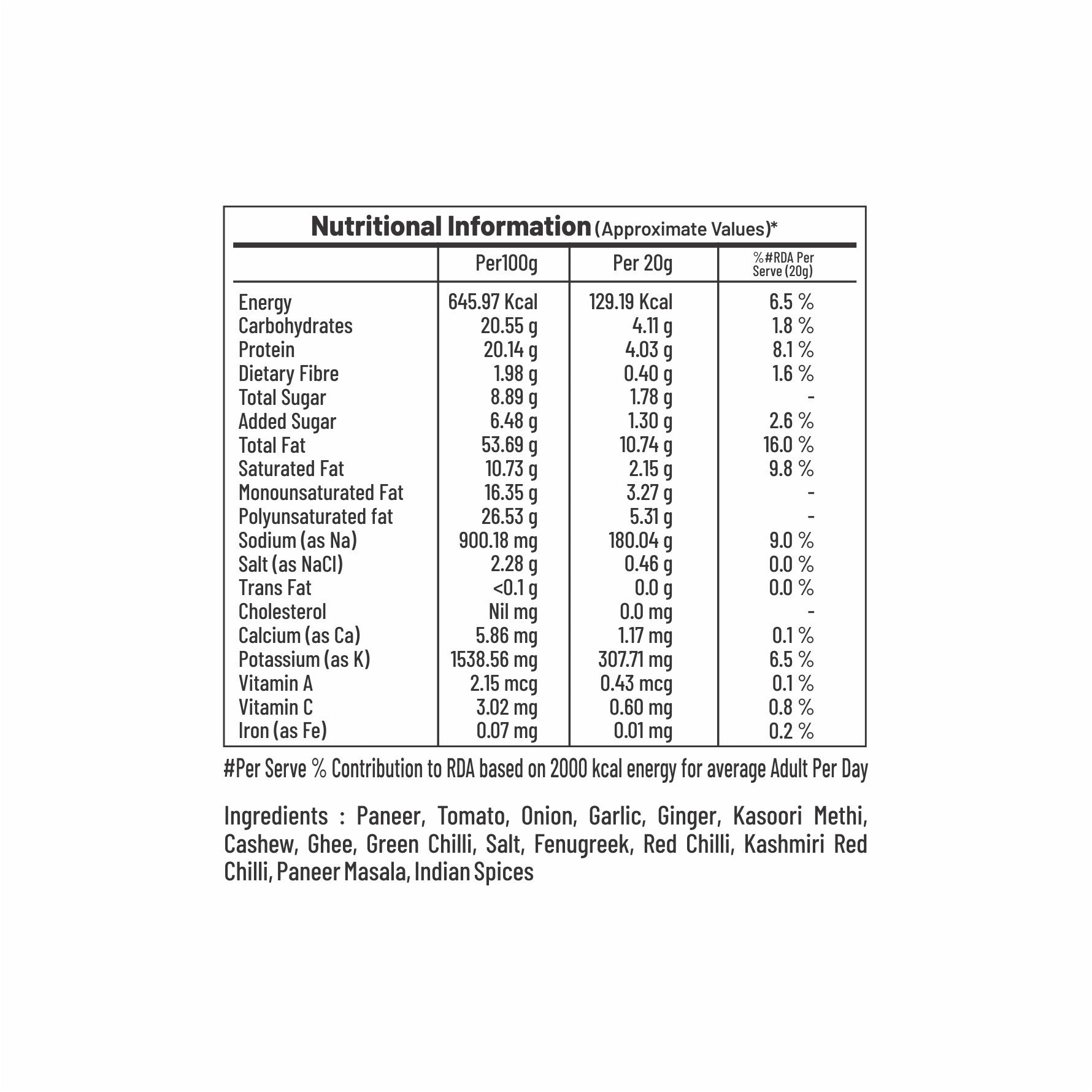 Enjoy the luxurious taste of Paneer Butter Masala, with its rich, creamy gravy and soft paneer cubes, all in a convenient, ready-to-eat package.